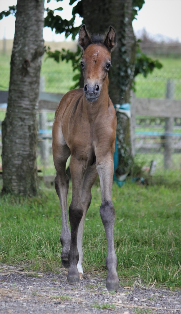 Elle s’avère être une pouliche très proche de l’Homme, toujours en demande d’attention. Pleine d’énergie et plutôt indépendante, elle ne vous laissera pas indifférent. Si vous chercher un futur compagnon de vie avec qui partager de longues heures de complicité à pied ou/et montée, elle sera vous combler. Elle possède un modèle très harmonieux, avec de belles rondeurs et une jolie tête arabisée. Elle toisera environ 1.52 m . Son déplacement, hérité de son père, est efficace !
